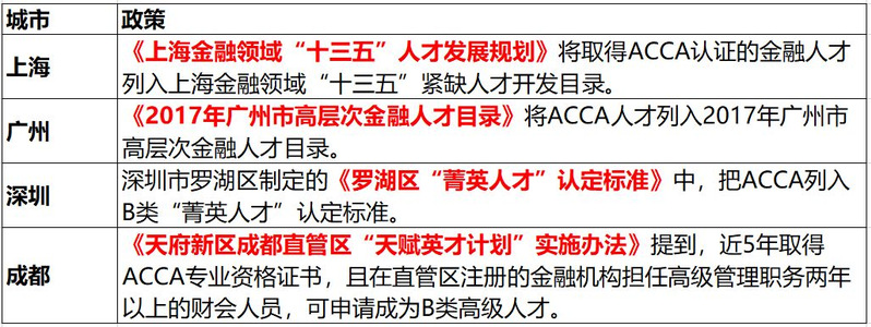 如表1所示,上海、广州、深圳等全国7个一线二线城市把ACCA列入高端金融、财会人才引进计划。