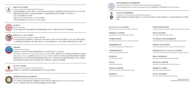 国外商科名校(例如波士顿大学,康奈尔大学,伦敦商学院,多伦多大学等)的商学院在申请留学生时,阶段性通过CFA考试可豁免GMAT的成绩要求,部分学校可获得课程豁免。