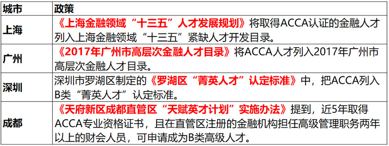 上海、广州、深圳等全国7个一线二线城市把ACCA 列入高端人才引进计划。